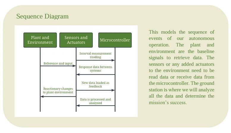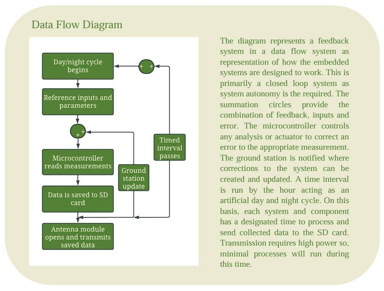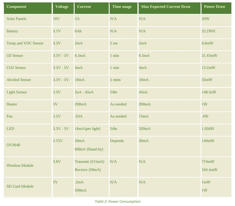 Our power budget is the foundation that will allow us to complete this mission. The system will maintain self-sustainability and power throughout the entire lifecycle to nurture the plant, while collecting data efficiently. Without proper power analysis of each component in our system, we would not be capable of carrying out this mission. Additionally, we had to work closely with the mechanical engineers in finding a solar panel that will provide enough energy to power our system along with providing enough additional power to maintain the battery’s charge for when the panels aren’t generating power. We also found a solar panel power controller that will mitigate the power efficiently between the battery, solar panels, and our devices being powered. Lastly, incorporation of controllable relays in our system will allow us to cut off devices that aren’t being used to save power even more.