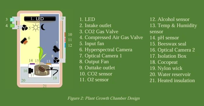 Specifically using opaque acrylic materials for isolating the plant from externals factors such as sunlight. The chamber will be designed and made with the dimensions of a 3U allowing for external resources such as CO2 and air to be attached externally. An outlet will be designed at the right of the chamber for half of the sensor array: CO2, alcohol, and O2 sensors. The isolation box will contain the rest of the sensor array including the temperature and humidity sensors. The left side of the chamber will be equipped with the feeding tube of air and CO2. Using a fan, constantly, fresh air will be inserted into the chamber from an inlet near the top left and purged through the outtake outlet where the concentration of the gases can be measured and recorded from the sensor array on the right.