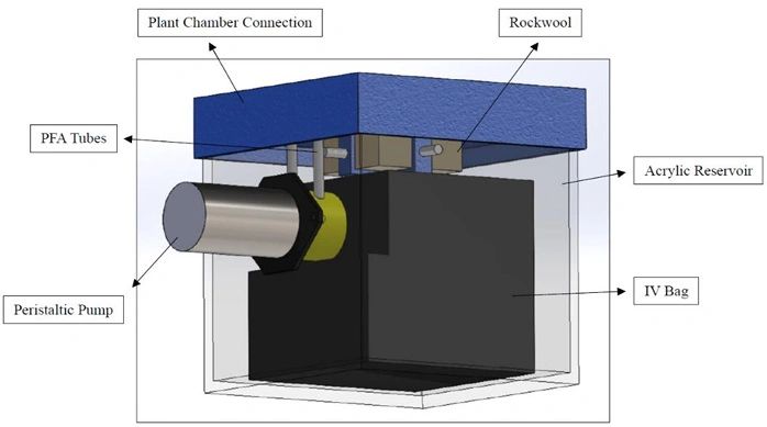 The base of the chamber acts as irrigation control and was designed by a team of mechanical engineers. The design consists of IV bags storing enough water for 30 days for 3 seeds of red romaine lettuce. The water would be transported from the bag to the seeds by a peristaltic pump, through flexible PFA tubes that would take the water directly to the seeds, fixed within the connection support. This connection will be holding the perfect environment for lettuce seeds in space: rockwool retaining humidity and providing stability for the plant to grow, and eventually become a nutritional meal to an astronaut in space.