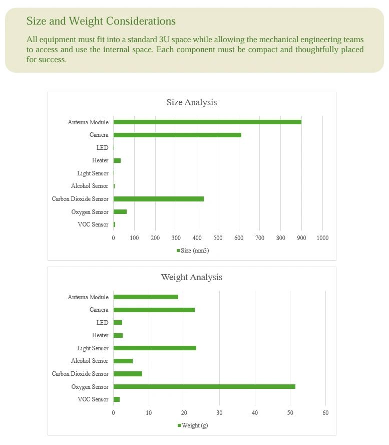 Monitoring these parameters is mandatory, as the simulation of red lettuce’s ideal natural environment negates variables either due to limitation of physical resources or overlooking one of its nuanced requirements. Accounting and supplying fundamental necessities through this system contributes to the study and can refine future experiments. To account for the condensed spacing, a specialized chamber, made of acrylic to isolate the red romaine lettuce from the environment and fitting within the dimensions of a 3U CubeSat was used. Table 1 presents solutions for the regulation of internal environmental factors by sensor data collection and a simplified control system. Air circulation will be maintained by a fan, with a velocity between 0.3 and 0.5 meters per second, ensuring evenly transmitted heat regulation and gas exchange needed for photosynthesis and transpiration at the leaf’s surface. LED strips placed above the chamber will provide blue (~450 nm) and red (~700nm) light to mimic natural light cycles, optimizing vegetation growth. The chamber features external outputs for air and CO2, with sensors placed in a printed bus for monitoring CO2, alcohol, O2, temperature, and humidity levels. The setup includes two fisheye cameras for imaging of the roots and leaf growth, which are also used as hyperspectral cameras. Imaging allows for assessing growth patterns and heath for observations in developmental changes over time. Chamber temperature must stay between 18–22 °C when external temperatures become severe in near space.