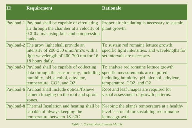 The proposed CubeSat mission will autonomously grow the candidate plant Red Romaine Lettuce and expose it to the stressors in LEO such as microgravity and radiation. As the driving requirements are derived by the respective candidate plant, it is imperative to monitor all aspects of the growth chamber. Therefore, a series of sensors such as temperature/ humidity sensors along with hyperspectral and optical cameras will be used to capture the impact the stressors impart on the plant and communicate it back to Earth. The resulting data can then be compared to previously collected control data from earth and the ISS. The investigation of autonomous plant development in the LEO microgravity environment to enhance our knowledge of space agriculture and contribute to the longterm sustainability of human habitation beyond Earth.